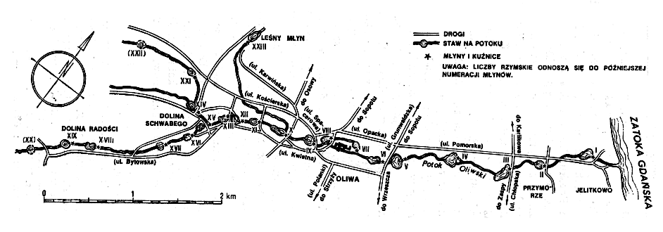 PLAN młynów i kuźnic na Potoku Oliwskim w XVII wieku (wg Jerzego Stankiewicza)