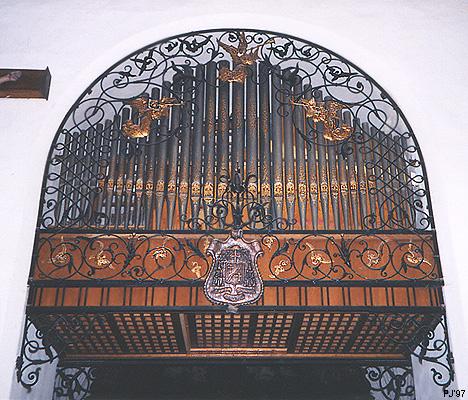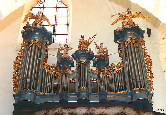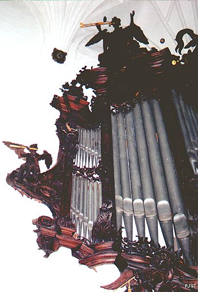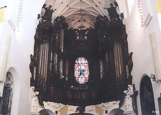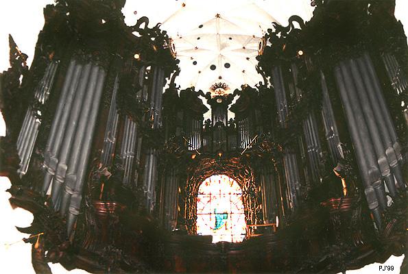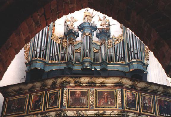 Praca brata Michała Wulffa trwała 25 lat. W tym czasie twórca musiał zmieścić potężny instrument w wąskiej nawie. Aby sprostać temu zadaniu Wulff umieścił piszczałki półeliptycznie, wysuwając największe piszczałki basowe przed balustradę chóru. Wielokondygnacyjnie ustawione piszczałki w głębi instrumentu otaczają owalny witraż, tworząc ciemną bryłę wznoszącą się nad białymi filarami wejścia. Prospekt organów wypełniony jest postaciami aniołów.